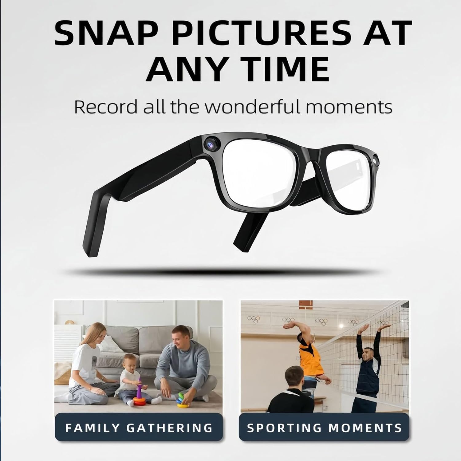 - Hassle-Free Recording: Capture memories or take work notes without the fuss! The built-in 8MP camera and large storage let you record photos, videos, and audio with a simple button press on the temple. Thanks to WIFI connectivity, view your content instantly on your phone—no memory cards or cables needed